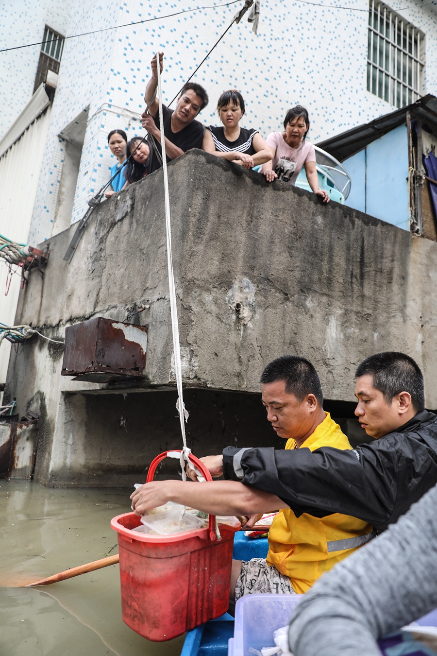 ????9月1日,潮陽區(qū)谷饒鎮(zhèn)華里社區(qū),救援人員給被圍困的群眾送來了食物。