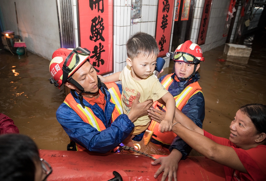 ????9月17日夜晚,陽江陽春市,消防戰(zhàn)士從被洪水圍困的房子里解救出一名兒童,放上救生艇。