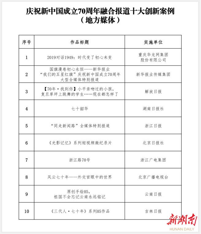 重慶華龍網(wǎng)集團(tuán)股份有限公司、新華報業(yè)傳媒集團(tuán)、解放日報、湖南日報社、浙江日報、北京日報社、浙江廣電集團(tuán)、北京廣播電視臺、云南日報、吉林日報獲慶祝新中國成立 70 周年融合報道十大創(chuàng)新案例(地方媒體)。