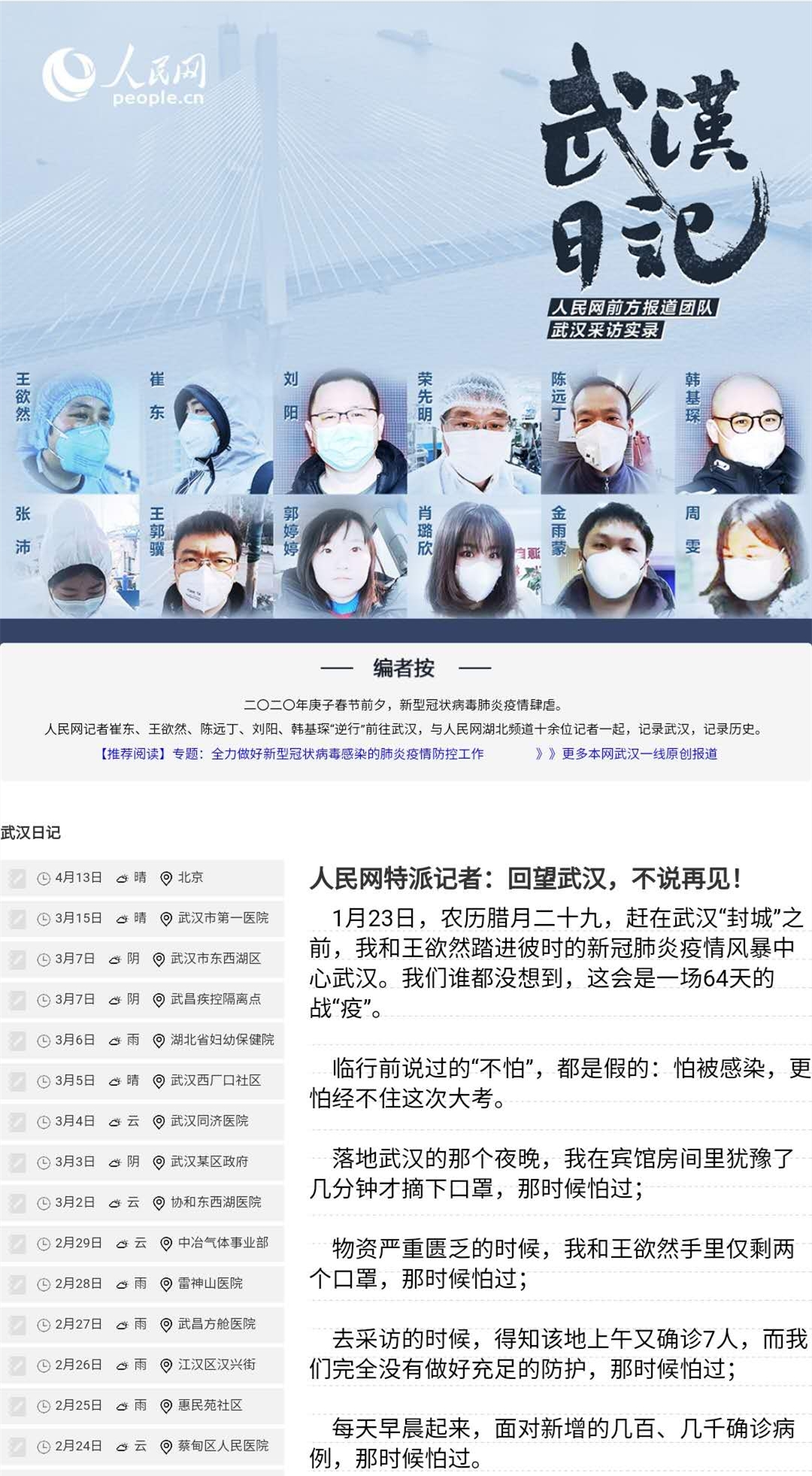 創(chuàng)作、刊發(fā)“武漢日記”的日日夜夜、點點滴滴,不僅是人民網(wǎng)貢獻戰(zhàn)“疫”力量、提供戰(zhàn)“疫”智慧的一個縮影,也是人民網(wǎng)踐行“四力”要求、勇于承擔社會責任的真實寫照。