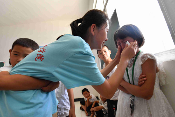 7月25日,在藍田縣厚鎮東咀村的一間臨時教室里,陜西學前師范學院大學生冀思瑞正在為孩子們上支教的最后一堂舞蹈課。課還沒上完,小女孩宋雨涵就忍不住哭了,另一個男孩朱佳寶更是緊緊抱住冀思瑞。