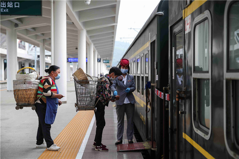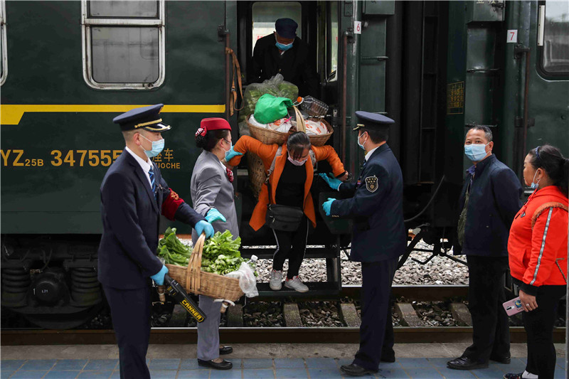 圖七:4月16日,貴州桐梓火車站,列車員幫助到站菜農下車。
