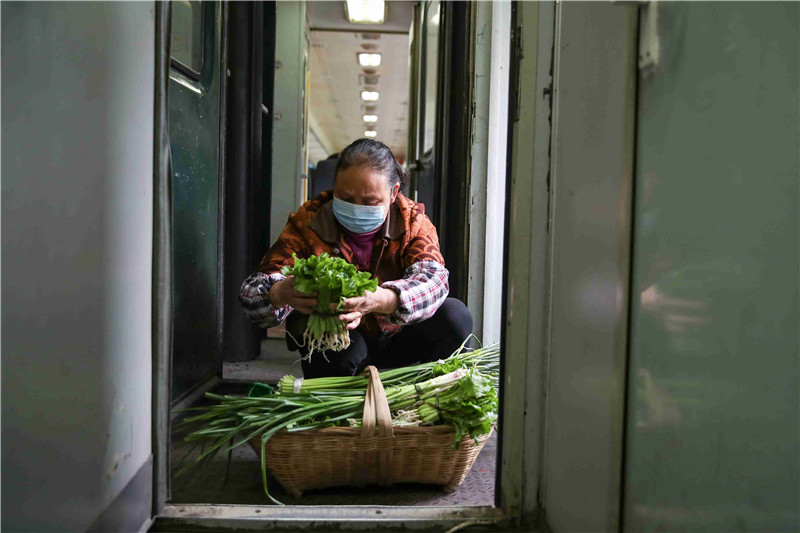 圖二:4月16日,民眾乘坐開往重慶的5630次列車到貴州桐梓售賣蔬菜。