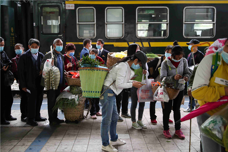 圖一:4月16日,遵義市的農戶背著蔬菜在月臺排隊上車,準備去貴州桐梓縣銷售。