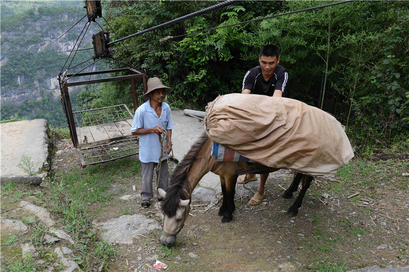 圖四:村民谷義清(左)用馬把山貨馱到索道邊送出村(2013年7月23日攝)。