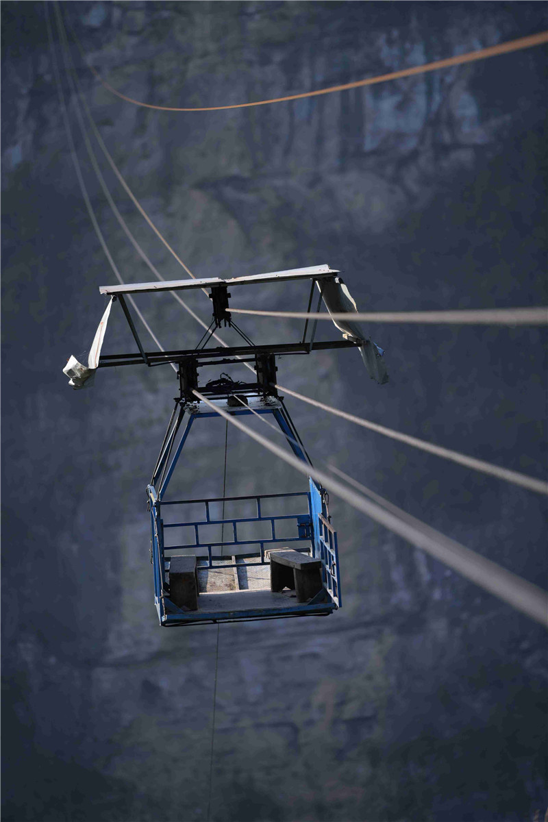長740米的索道距谷底近500米,一個簡陋的鐵筐就是張鐳口中的“鐵籃子”。沒有公路,出村要步行一整天,坐索道只要幾分鐘。因此,即使再害怕,村民們也大多選擇它。
