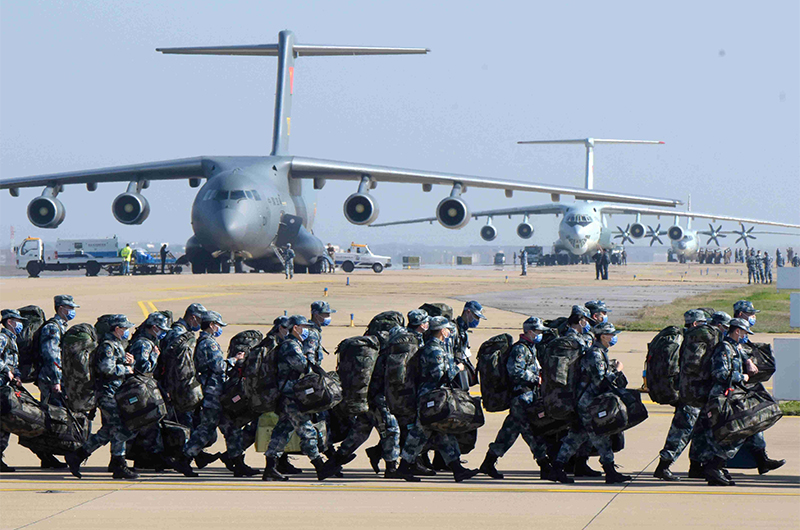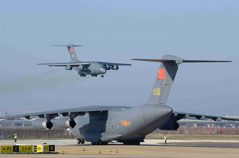 圖二:2月17日,軍隊支援武漢抗擊新冠肺炎疫情的醫護人員乘坐空軍運輸機抵達武漢天河機場。