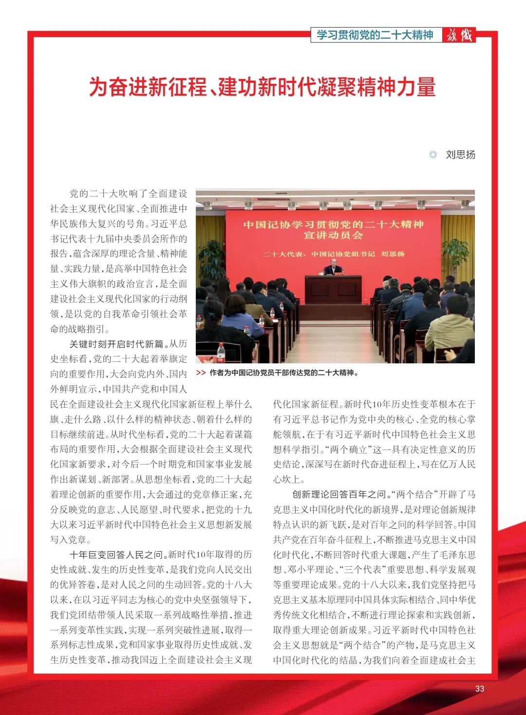 《旗幟》雜志2022年第11期刊發了中國記協黨組書記、副主席、書記處書記劉思揚署名文章《為奮進新征程、建功新時代凝聚精神力量》。
