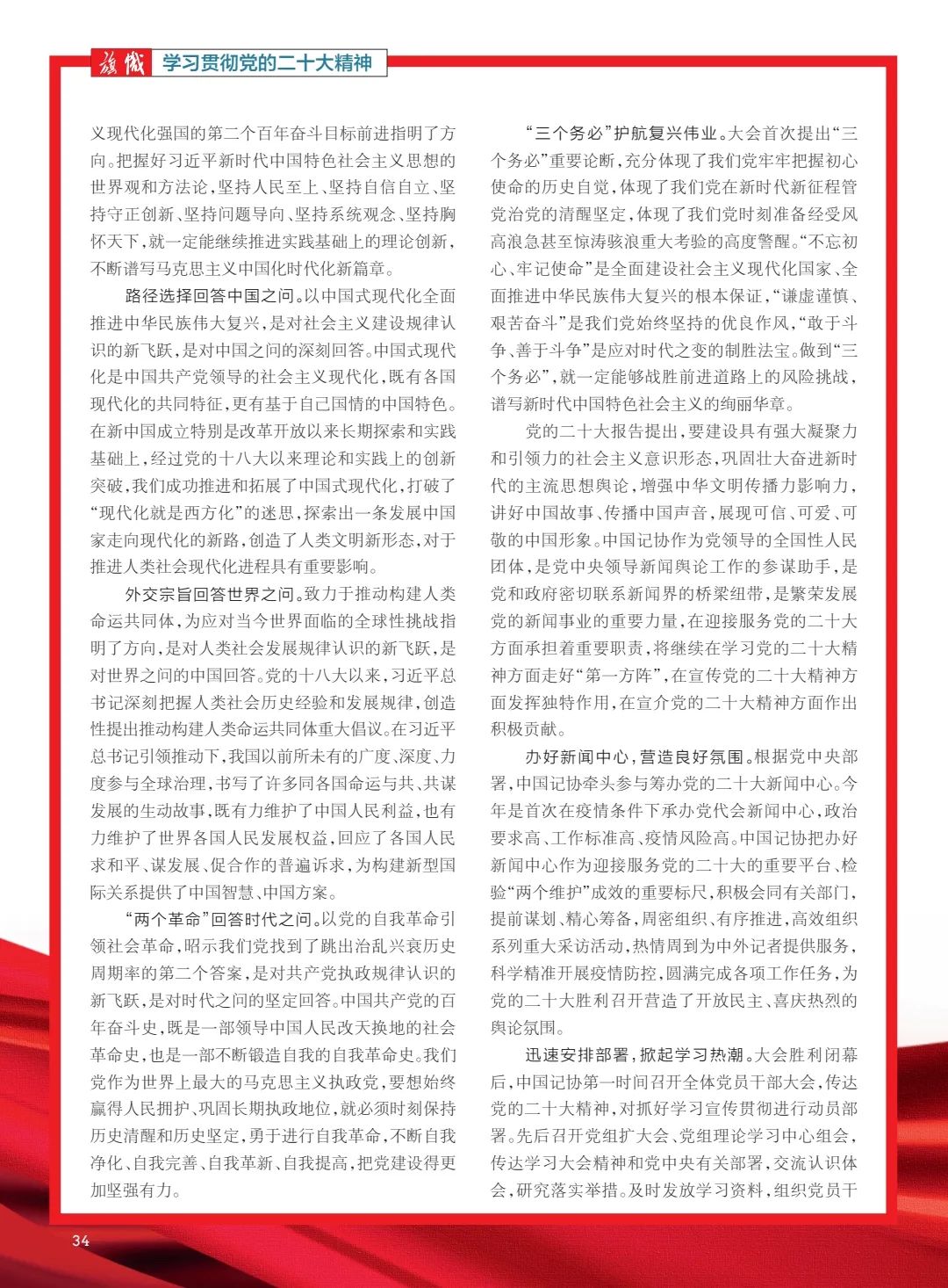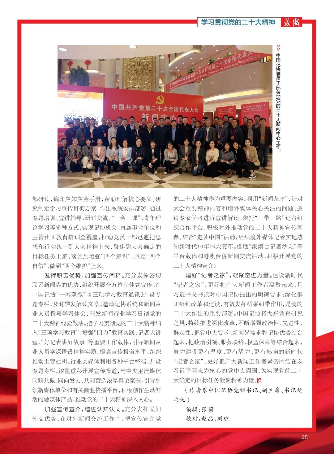 文章圍繞黨的二十大取得的重大成果和重要意義分享了學習體會和認識,介紹了中國記協作為黨領導的全國性人民團體,在迎接服務黨的二十大、學習宣傳貫徹黨的二十大精神等方面的主要做法和舉措。