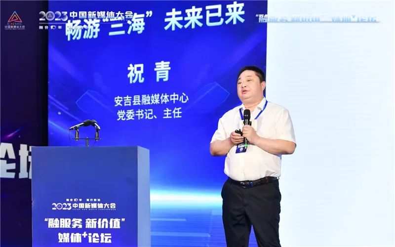 ▲浙江省安吉縣融媒體中心黨委書記、主任祝青在“媒體+”論壇上作主題演講。