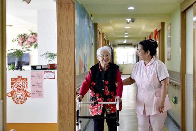 2024年5月25日,在山東省日照市東港區(qū)石臼街道日照幸福護(hù)理院,工作人員在陪護(hù)老人。新華社記者 郭緒雷 攝