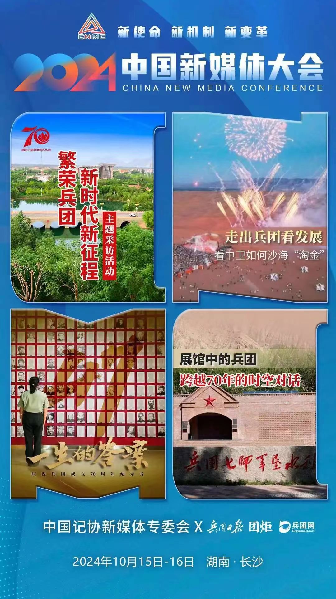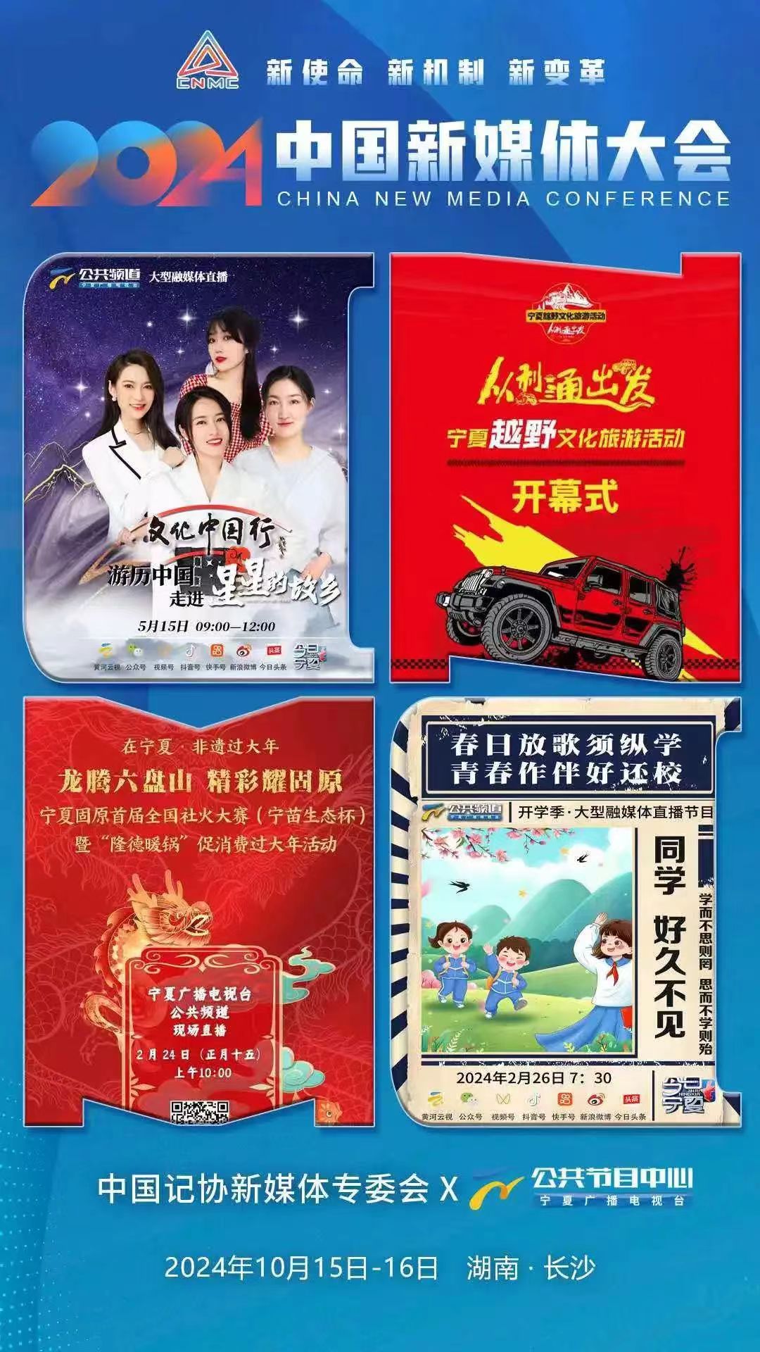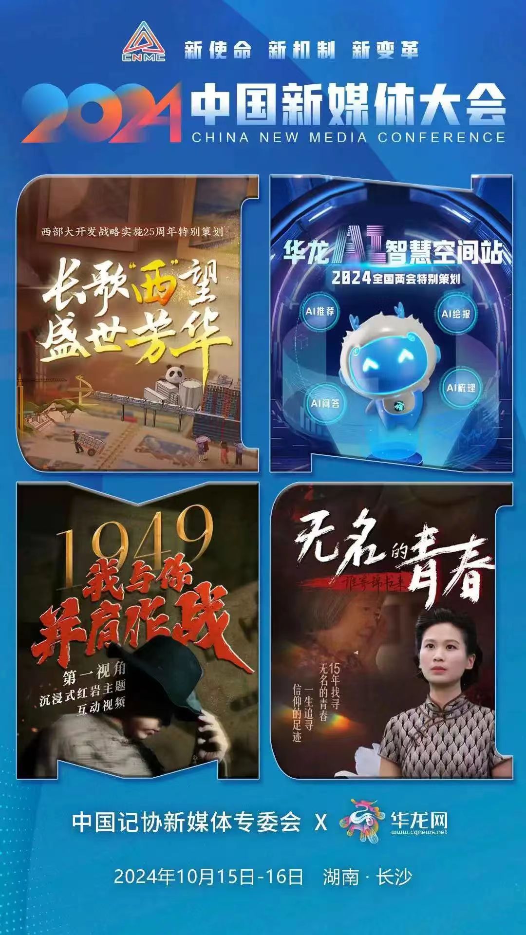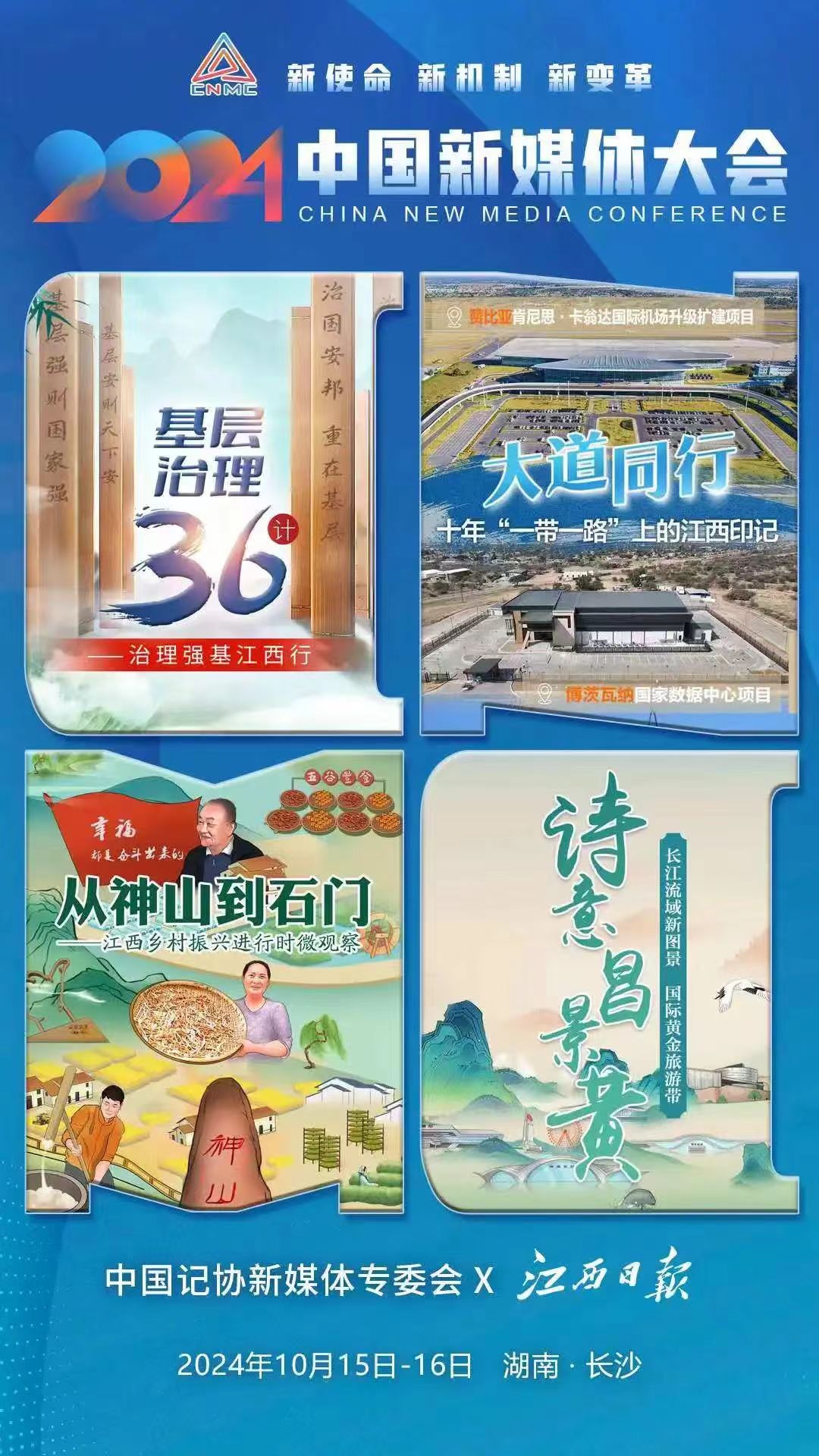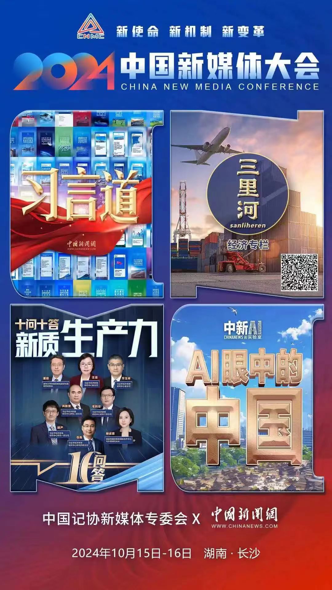 2024中國新媒體大會將于10月15日至16日在湖南長沙召開,中國記協新媒體專業委員會各成員單位紛紛推出“聯名海報”為大會預熱。