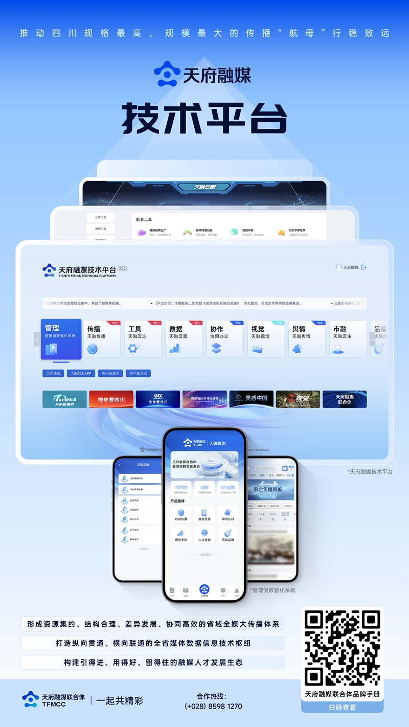 天府融媒技術平臺是天府融媒聯合體核心能力平臺集技術聯通、數據融通、主業貫通于一體,核心涵蓋“天融之聲”聯合傳播與“天融之芯”技術底座。該平臺亮點包括:“天融云選”匯聚公益資源,“天融云眼”透視數據全貌,“天融數治”智化管理體系,“天融云生”促進媒體深度融合,“天融菁才”打造人才賦能高地。通過創新聯合傳播、“輪值內容官”機制與移動化管理工具,平臺高效統籌省域宣傳報道工作,匯聚6大類80余項關鍵數據,實現全省宣傳資源“一盤棋”管理。天府融媒技術平臺正引領四川走向全方位、立體化的傳播新時代,展現獨特魅力與強勁動力。