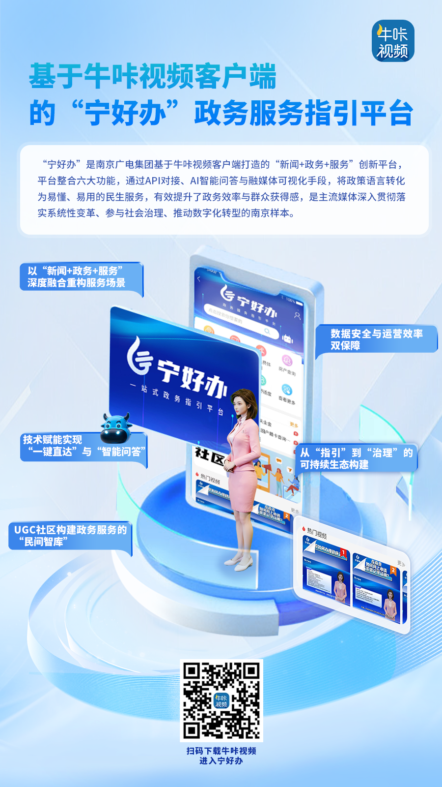 “宁好办”是南京广电集团基于牛咔视频客户端打造的“新闻+政务”创新平台,平台整合政务服务资讯、政务服务指引、智能客服、高频事项办理、互动社区及视频指引六大功能,通过API对接、AI智能问答与融媒体可视化手段,将政策语言转化为易懂、易用的民生服务,实现“一键知晓、一键直达”,有效提升了政务效率与群众获得感,是主流媒体深入贯彻落实系统性变革、参与社会治理、推动数字化转型的南京样本。